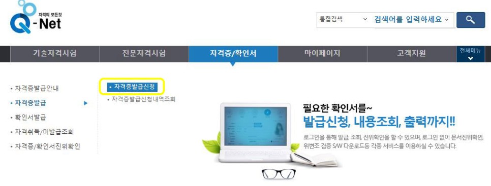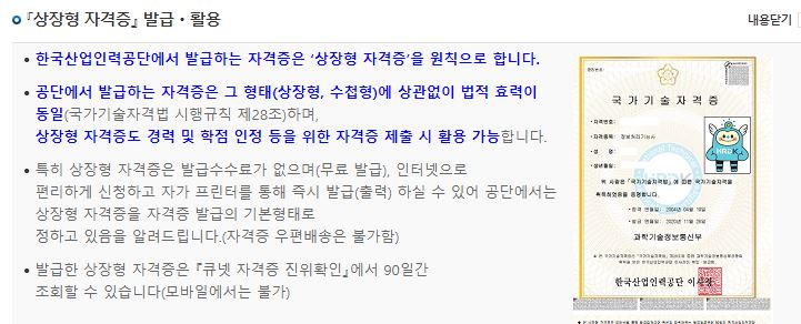 홈 자격/확인서 자격증 발급 신청 자격증 발급 신청 『상장형 자격증』 발급·활용 한국산업인력공단에서 발급하는 자격증은 「상장형 자격증」을 원칙으로 합니다. 공단에서 발급하는 자격증은 그 형태(상장형, 수첩형)에 관계없이 법적 효력이 동일(국가기술자격법 시행규칙 제28조)이며 상장형 자격증도 경력 및 학점 인정 등을 위한 자격증 제출 시 활용할 수 있습니다. 특히 상장형 자격증은 발급 수수료가 없고(무료발급), 인터넷으로 편리하게 신청하고 자가 프린터를 통해 즉시 발급(출력)할 수 있어 공단…www.q-net.or.kr