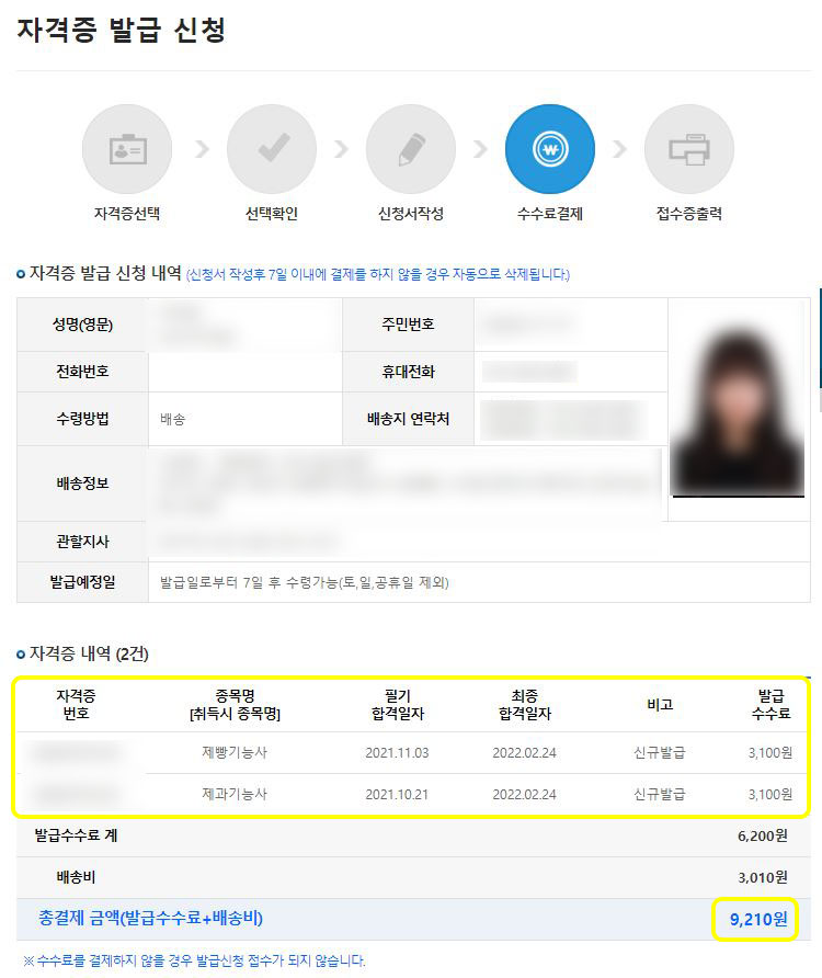 제과/제빵기능사 각각의 발급수수료는 3100원 그리고 배송료 3010원까지 총 9210원 결제!