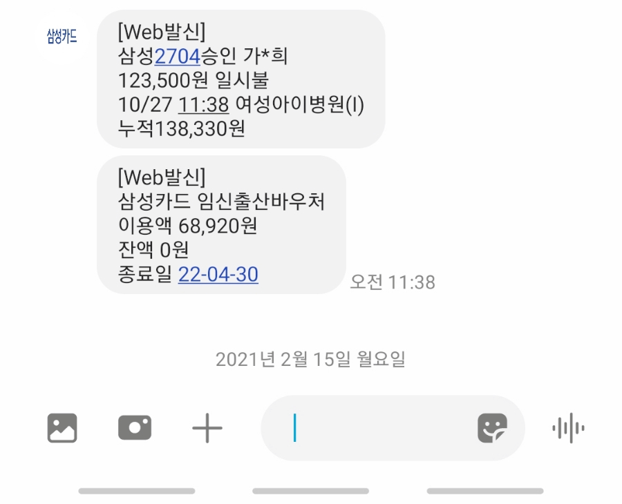 1차 임신 기형아 검사 비용은 1,23500원이었습니다.혈액 검사와 초음파 검사까지 합쳐서 12만원대가 나온 것 같습니다.저는 고위험 산모와 병원에도 자주 가는 약주사약이 많아서 ㅠㅠ다른 사람의 출산 전까지 쓴다는 임신출산 바우처를 12주에 다 써버렸네요……잔액 0원..^^ㅋㅋㅋㅋ병원비는 정말 남들보다 5배는 쓴 것 같아서…