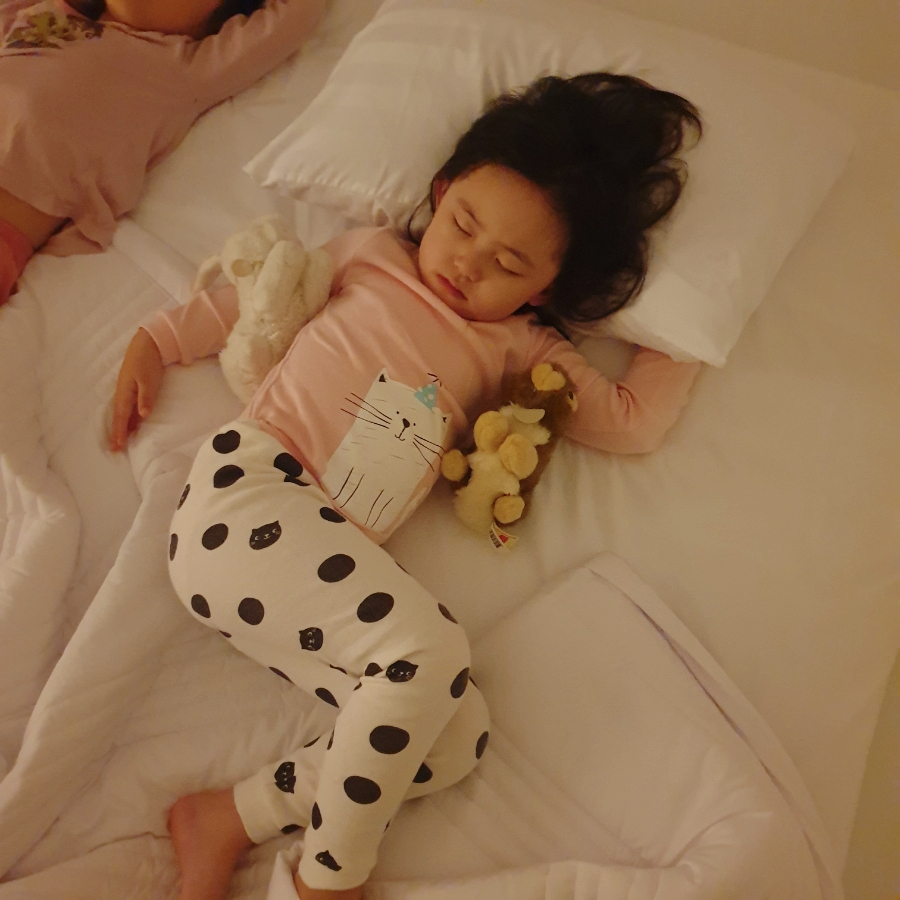 좋아하는 토끼인형은 이때도 여전히 흰토끼 갈색토끼를 모두 가져가 안고 잤지.귀여워♥ 꼭 1년전인데 아기 같네.