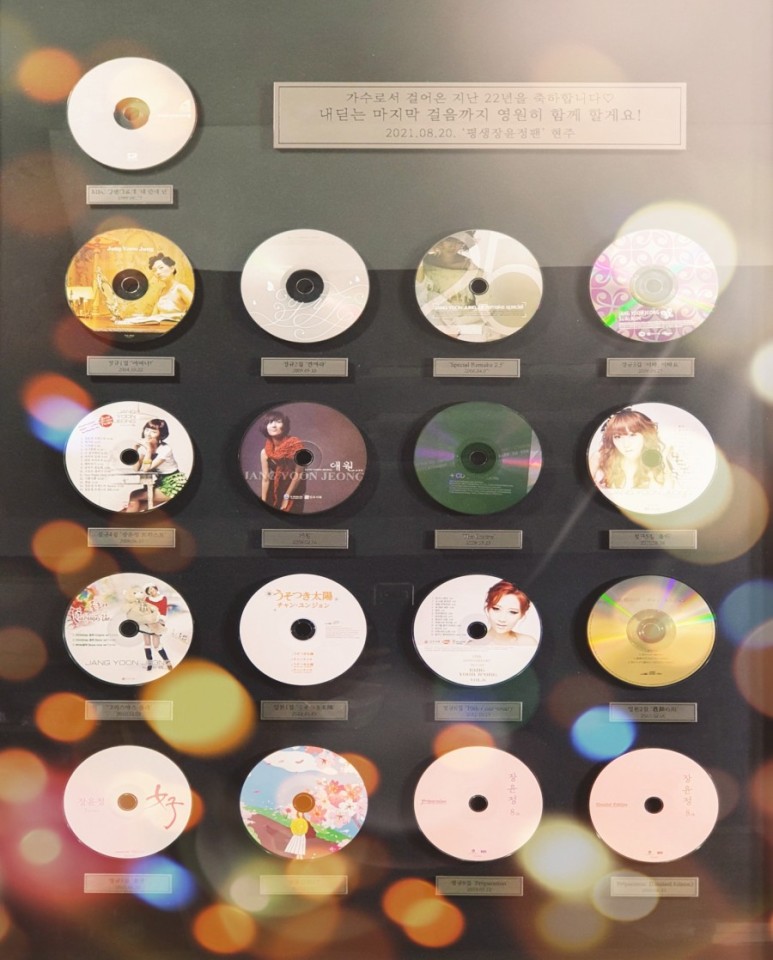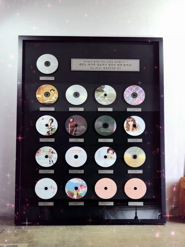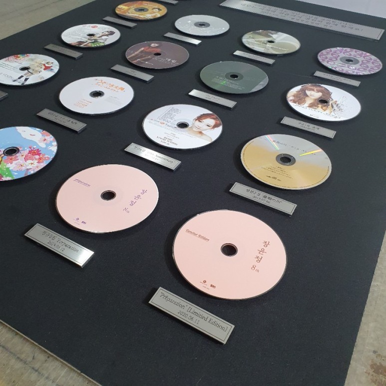 애정 열혈 팬들이 데뷔 후 그동안 발표한 앨범을 정성껏 모아 CD 17장을 각각의 명판도 만들어 한 장의 액자에 넣었습니다.