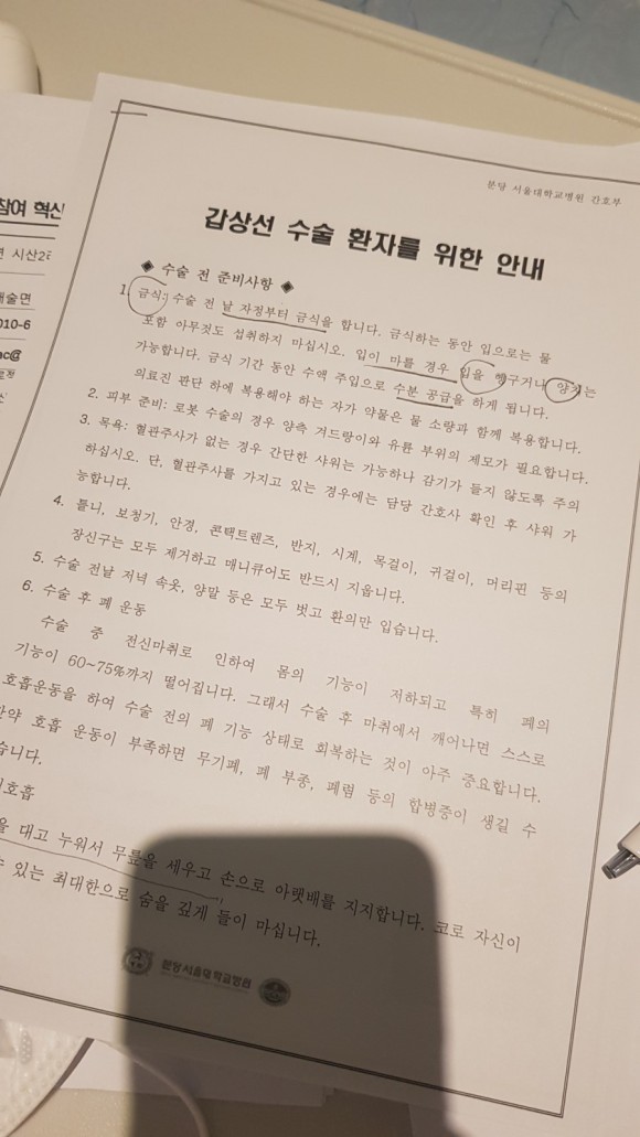 수술 전 준비사항 단식(수술 전날 자정부터 단식) 겨드랑이 탈모, 장신구와 매니큐어 제거 수술 후 폐운동을 위한 심호흡 연습 수술을 가기 전 속옷 탈의와 소변 외롭지만 씩씩하게 입원 절차를 밟고 첫날은 5인실에서 자고 간호사실에 이야기하고 남은 날은 2인실에서 묵는 5인실이나 2인실 병상 크기는 같다.