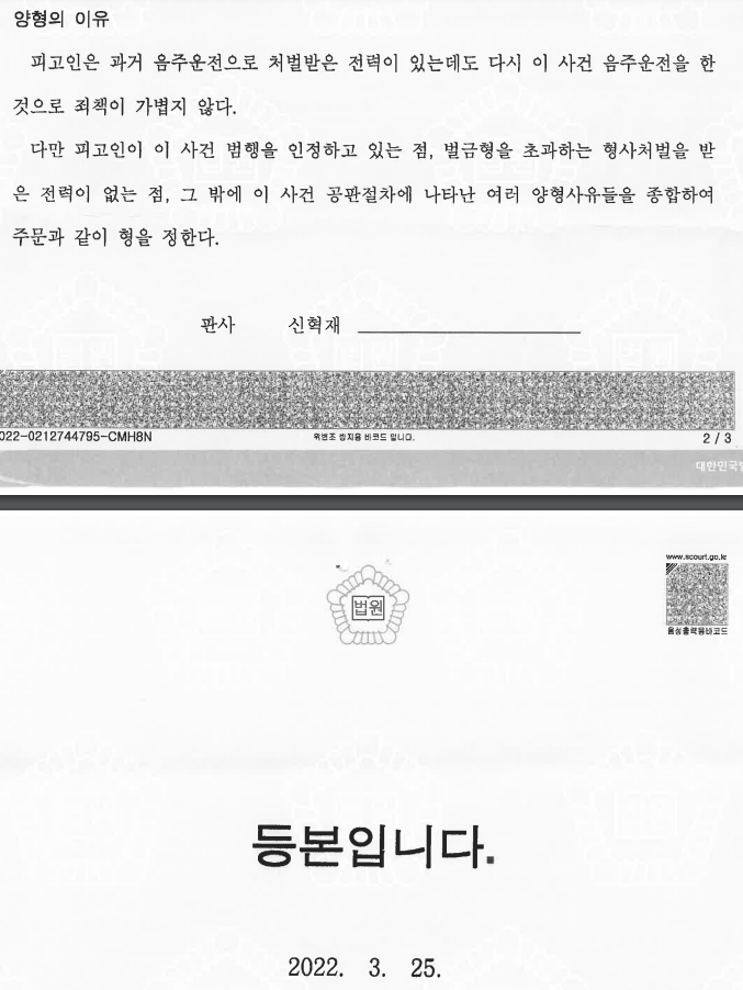 다음은 윤창호법 위헌결정 이후 2022.3.25. 음주운전 2회 이상의 전력이 있을 경우 서울중앙지방법원에서 2022.3.25. 벌금형을 선고받은 사례다.