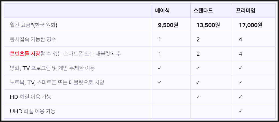 그리고 넷플릭스뿐만 아니라 모든 OTT 플랫폼의 경우 요금제가 여러 개 나뉘어 있어 시청 제한이나 디바이스 제한 등을 두고 있습니다. 넷플릭스의 경우 베이직 9,500원 요금 결제 시 1인 시청, 콘텐츠 저장은 디바이스 1대 화질의 경우 일반 화질 이용으로 편성되어 있습니다.