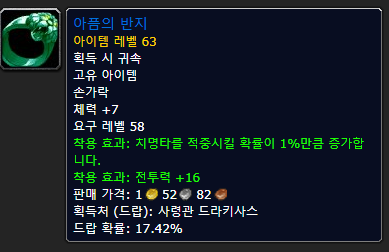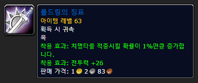 목걸이도 마찬가지입니다. 동부역병지 대영괴 중 가족과 사랑이라는 퀘가 있는데, 그것은 마지막으로 하스그렘이나 그곳에서 호위퀘를 마무리하면 주는 아이템입니다.목걸이도 사실 이만한게 없어요.타우리산이 주는 목걸이가 있는데 치명타 때문에 넘을 수 없는 벽 목걸이입니다.