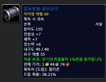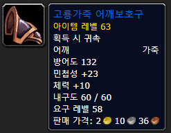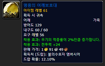 어깨는 적중을 위해 명중인 어깨 프로텍터가 Bis에 실린 아이템인 것 같습니다.드워프or트롤이라면오히려솔름정문의발나자르가주는이어깨가Best인가봐요.결국 적중 9%를 맞출 수 있다면?고룡가죽 어깨 보호구를 선택하세요.