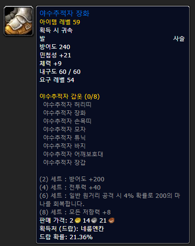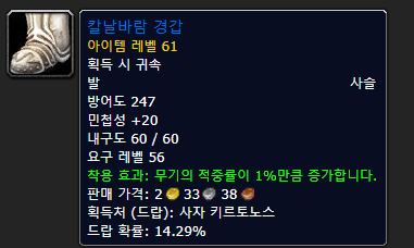 신발은 솔무 뒷문에서 주는 야수 추적 자기장 신발 또는 스컬퀘템이 있어야 소환 가능한 라이온 킬토노스가 주는 신발이 BIS인데 사실 힘들어도 퀘하해서 칼바람 경갑을 드시는 것이 좋습니다.적중 아이템은 사용하지 않더라도 세팅을 위해 많이 가지고 있는 것이 최선입니다.