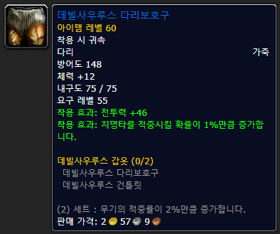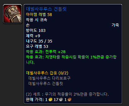 장갑은 가죽 세공 제작 아이템인 데빌사우루스 건틀렛입니다. 이는 두 세트의 효과가 적중 2%여서 선호하며 전투력과 치명타까지 훌륭한 스탯을 자랑하는 아이템 중 하나입니다.