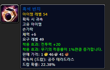 반지는 나오는 곳이 별로 없어서 마우동 흑석반지.. 이건 솔직히 먹기 힘들어요.공주의 직접 팟에 가는 사람들은 다 저걸 보고 가기 때문에 나와도 먹기도 힘들고 팟도 잘 안 넣어줘요.나락 퀘스트 반지에 첨탑 상층 반지 2개를 끼우는 것이 최선이라고 생각합니다.