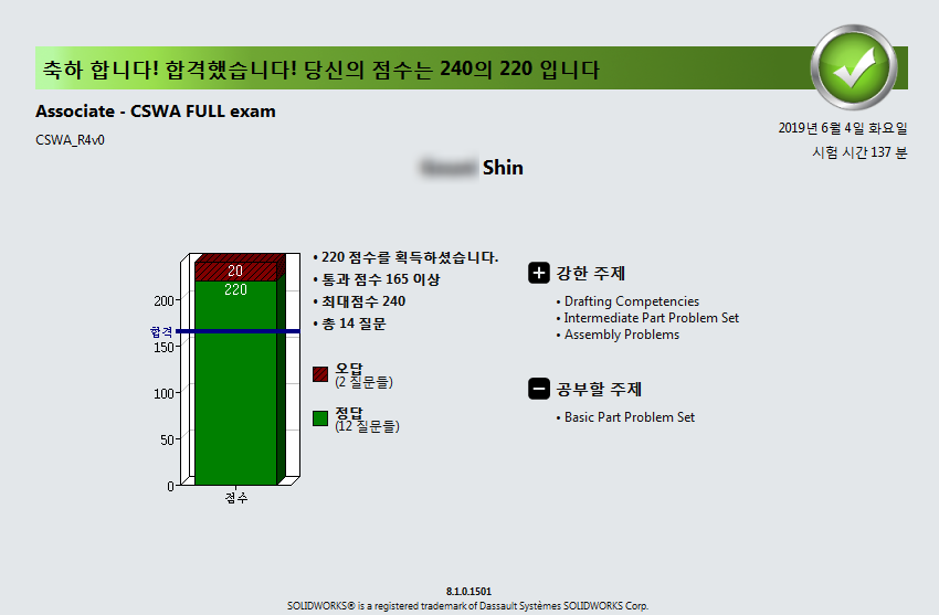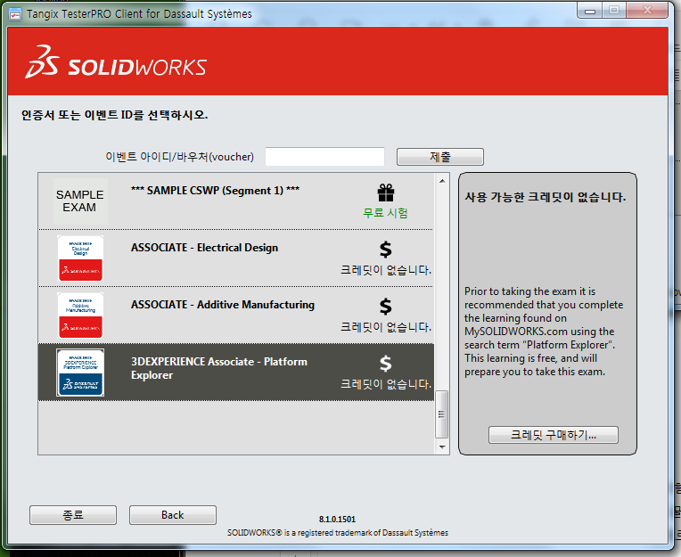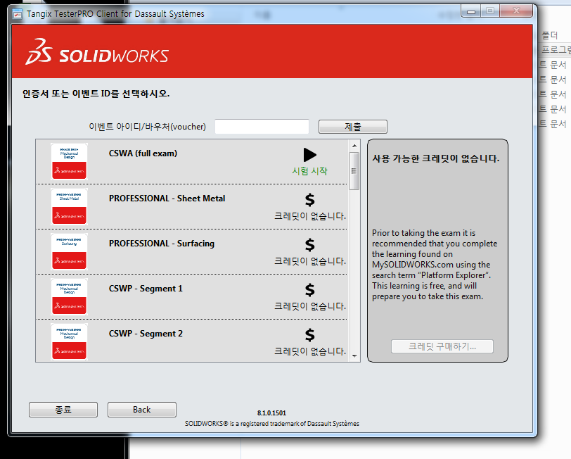 시험을 보려면 일단 크레딧이 필요해.자격시험은 어디서나 볼 수 있다.솔리드웍스를 운용할 컴퓨터나 시설이 부족한 것 같다.
