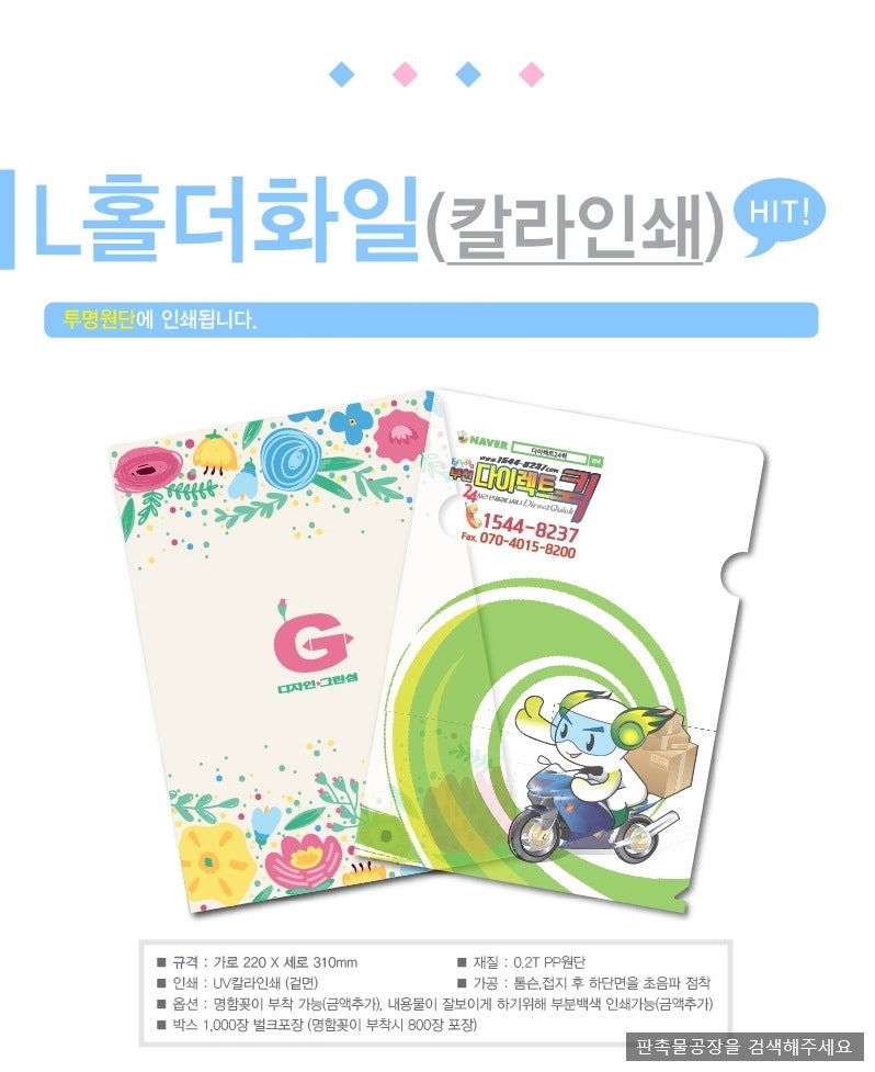 L자 파일 제작, 묵박 인쇄로 선명하게 L자 파일 제작은 학원이나 학교에서 많이 하시는 편입니다. 학생들이 프린트물을 간편하게 보관하기에 편리한 수단이므로 L자 파일 인쇄를 하여 배포하면 좋은 간접 홍보 수단이 되기도 합니다.L자 파일의 제작은 컬러 인쇄와 박인 인쇄의 두 종류로 나뉘게 됩니다. 칼라인쇄는 인쇄문 색상이 다양하고 내용이 많을 때 선택해주세요.박인채는 간단한 문구를 인쇄하여 최대한 저렴한 비용으로 원할 때 추천합니다.오늘은 학원에서 박인채로 L자 파일을 제작한 사례를 준비해 왔습니다. 여러가지 색상 중에서도 선명하게 글씨가 잘 보이는 묵박을 골라주셨어요. 그럼 지금부터 자세히 보여드릴게요! 학원 ㄱ자파일 제작