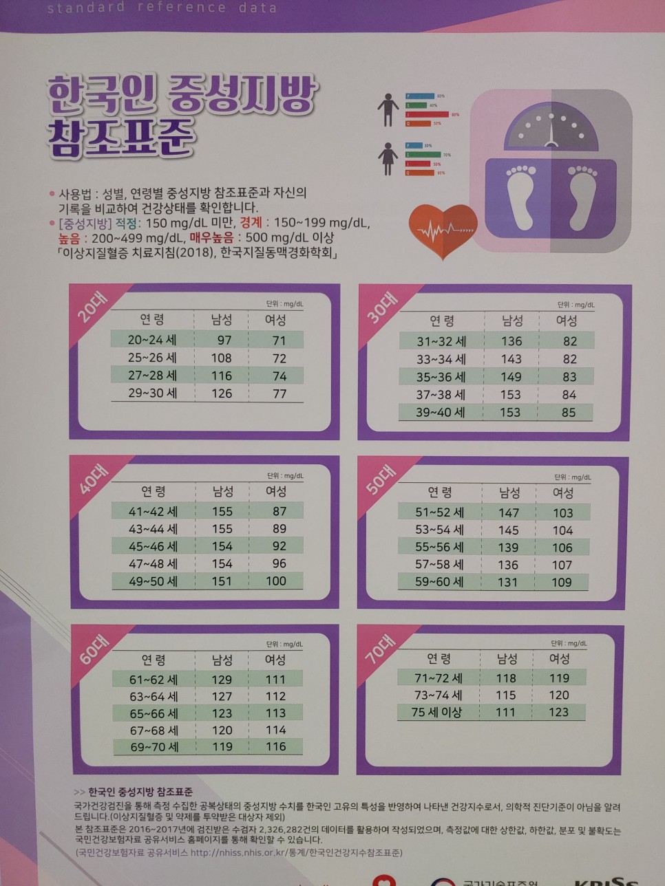 40이하[낮다]저밀도 LDL 콜레스테롤 수치 100 미만, 100-129130-159160-189, 190 이상의 중성지방 수치 150-1992 00-499, 500 이상의 건강검진 시 정확한 검사를 위해 최소 9시간~12시간 정도의 공복이 필요합니다. 중성 지방의 경우, 식후 검사에서는 비정상적으로 높은 수치를 나타낼 수 있습니다.