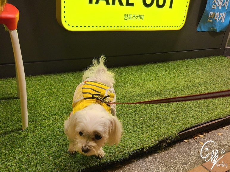 요즘 자주 가는 집 앞 컴퍼스 커피커비가 여기 가면 저 바닥에 집착(?)한다. 바닥의 인조잔디가 왜 마음에 드니?