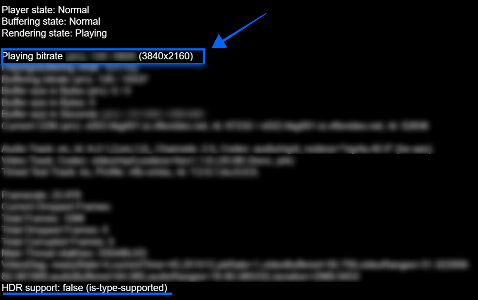 그러면 영어로 텍스트가 나오는데 모든 것을 알 필요는 없고 비트레이트 부근에서 현재 해상도를 확인할 수 있습니다. 다른 ott들도 마찬가지지만 처음에는 낮게 나왔지만 점점 올라가는 방식입니다. HDR은 제가 꺼놨으니까 이렇게 나오네요.