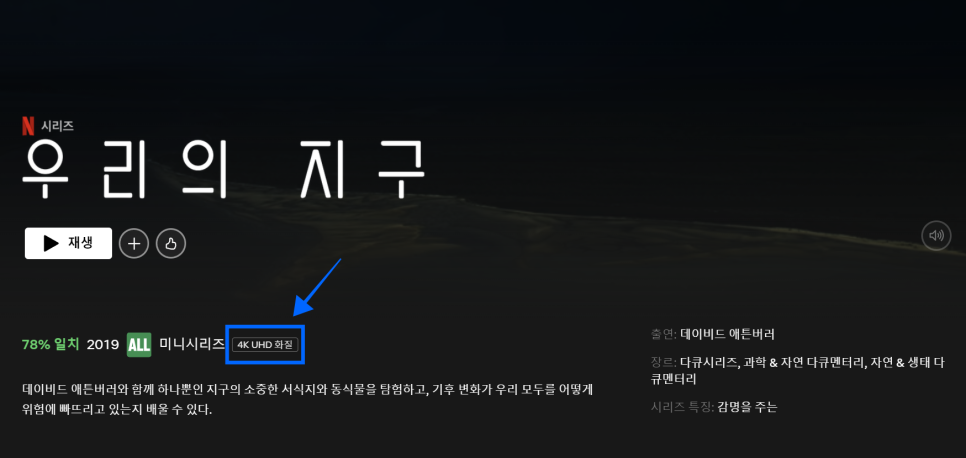 콘텐츠 소개를 보면 4K UHD 화질 표시가 있는 것으로 무엇이든 테스트해 봅니다. 실제로 어느 해상도로 송출되고 있는지는 영상이 흘러나오는 도중에 Ctrl+Alt+Shift+D 단축키를 눌러보면 비트레이트로 현재 해상도를 확인할 수 있습니다.