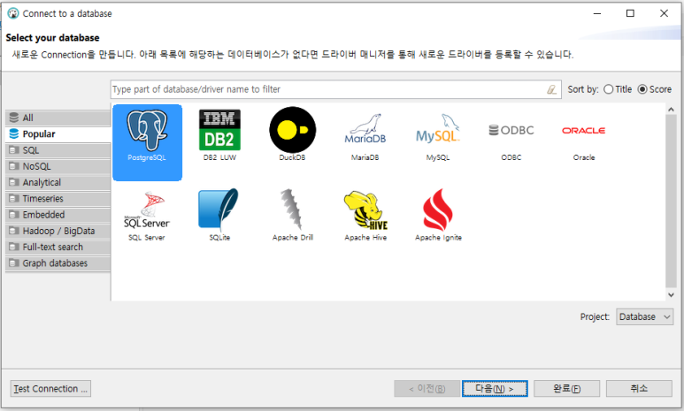 이 중 우리는 Postgre SQL을 사용하기 때문에 가장 먼저 나와 있는 PostgreSQL을 클릭하고 다음 버튼을 클릭한다. 클릭하면 Connection에 필요한 정보를 기입하는 창이 나온다.