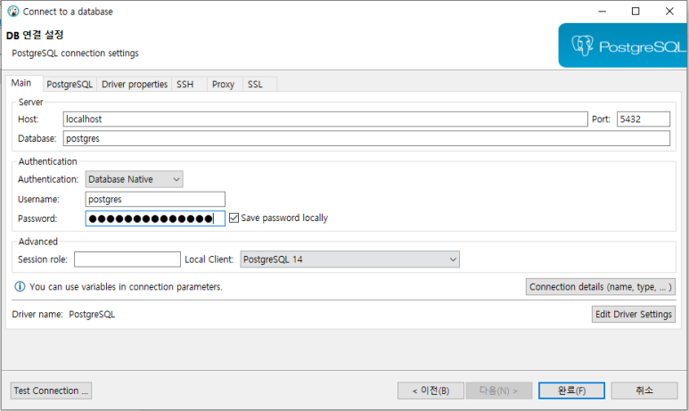 상기 내용 중 중요한 것은 PostgreSQL 서버가 동작 중인 서버의 IP 주소를 Host에 기입하고 사용할 데이터베이스 이름, PostgreSQL 서비스가 실행 중인 포트 번호를 기입한다. 기본적으로 PostgreSQL을 설치하면 자동으로 postgres라는 이름의 데이터베이스가 생성되며 포트번호는 432번 포트에서 실행된다. 다음으로 유저명과 패스워드를 기입한다. 현재 생성한 사용자가 없기 때문에 관리자 계정인 postgres에 접속하고 해당 계정의 비밀번호는 먼저 설치할 때 설정한 비밀번호를 입력하면 된다.기입을 완료한 후 왼쪽 하단의 Test Connection을 클릭하여 연결이 정상되었는지 확인한 후 “완료” 버튼을 눌러 DB 연동을 완료하면 된다.