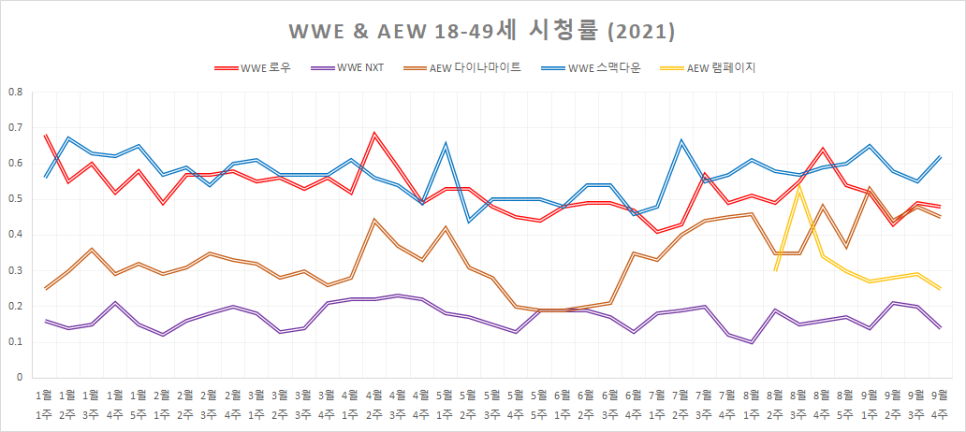 8월 2주 0.490.190.350.580.38월 3주 0.550.150.350.570.538월 4주 0.640.160.480.590.348월 5주 0.540.170.370.60.39월 1주 0.520.140.530.650.279월 2주 0.430.210.440.580.289월 3주 0.490.20.480.299월 4주 0.480.140.450.620.25 #WE #로우 #NXT #다이너마이트 #스맥다운 #
